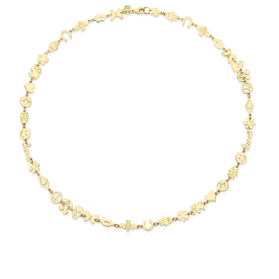 This delicate 14k yellow gold necklace features Sydney Evan's signature multi-icon design, combining symbols of meaning and elegance. Each icon is thoughtfully chosen to represent unique themes—protection, love, and good fortune. The 16" chain offers a refined and versatile length, making it a perfect addition to any collection, whether worn solo for a subtle statement or layered for a more personalized touch. Ideal for those who appreciate meaningful, timeless jewelry with a modern twist.