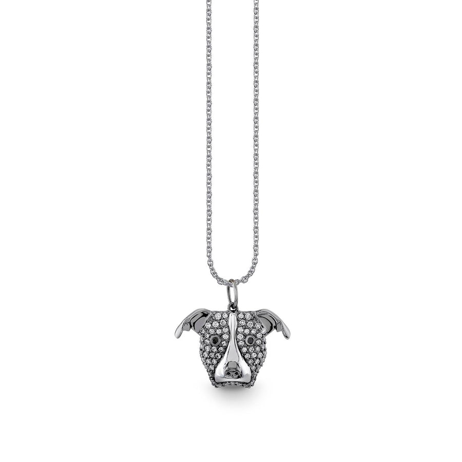 Embrace strength and loyalty with this striking black rhodium and diamond Pitbull dog charm. Featuring mesmerizing black diamond eyes, this charm embodies the Pitbull's fierce yet loving nature. Measuring approximately 3/4' in height and 1/2' in width, it is a bold statement piece that captures the spirit of a devoted companion. The fine cable chain is 16' long with an 18' extender, allowing for versatile styling. Wear this charm as a symbol of protection, courage, and unwavering loyalty, and let it remind you of the powerful bond between you and your beloved canine.