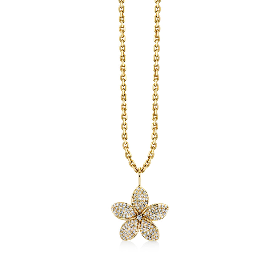 14k yellow gold and diamond large plumeria charm necklace. The charm measures approximately 3/4" x 3/4". Fine 14k gold diamond cut chain is available in 18", 20" or 22" lengths.