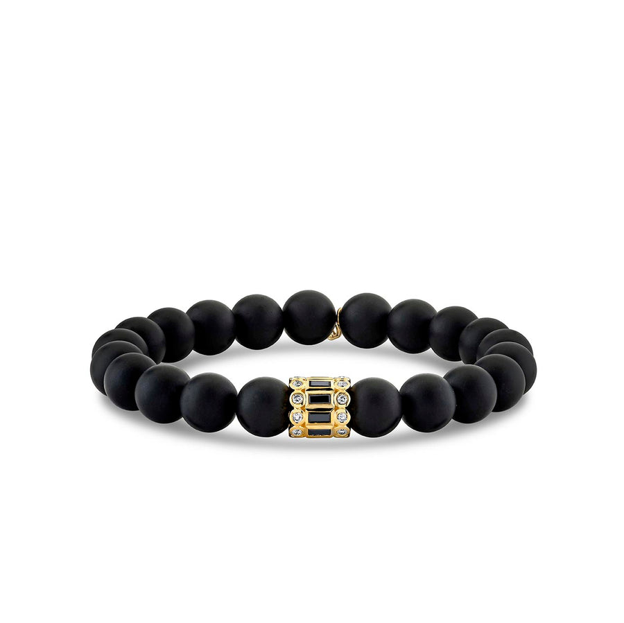 This exquisite bracelet masterfully blends 14k yellow gold with sparkling black diamonds to create a truly luxurious and sophisticated accessory. The design features an intricate arrangement of baguette and round bezel rondelles, which add a distinctive and refined touch to the piece. Complementing this opulent design are 8mm black matte onyx beads, their smooth, bold surface offering a striking contrast to the radiant gold and shimmering diamonds.