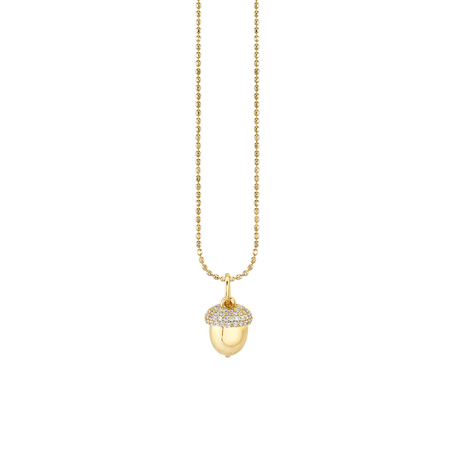 This 14k yellow gold and diamond 3D acorn charm necklace embodies the spirit of growth, potential, and strength. The acorn, a timeless symbol of new beginnings, represents the potential within each of us to grow into something magnificent. Suspended from a fine 14k yellow gold cable chain, the 16" length with an extender at 18" offers versatility and the perfect fit. The delicate diamonds set in the acorn charm add a touch of light, symbolizing wisdom and the enduring beauty that comes from within. A piece that not only enhances your style but carries with it a message of personal transformation.