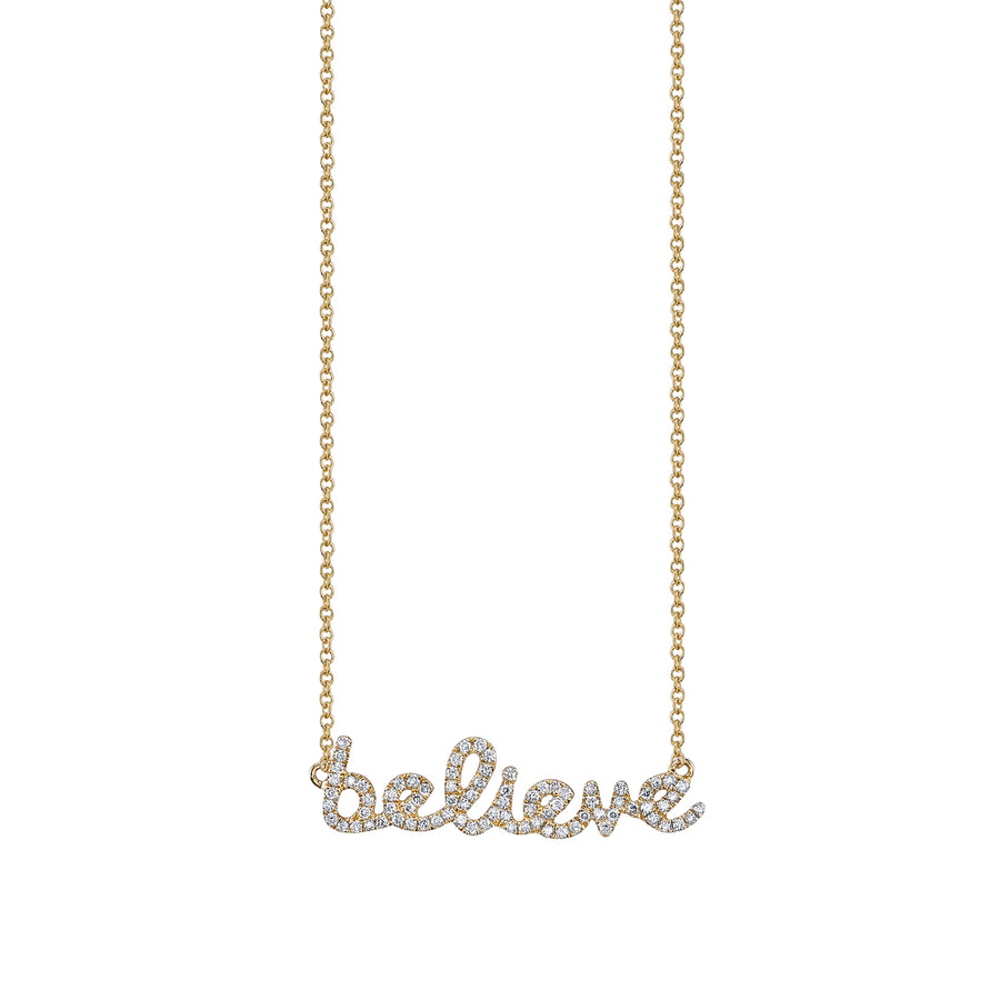 A radiant expression of inner strength, this necklace features the word "Believe" beautifully crafted in our signature SE script and adorned with pavé-set diamonds for a touch of celestial sparkle. Measuring approximately 1" across, the word "Believe" symbolizes faith in oneself, dreams, and the limitless possibilities ahead. The adjustable chain, which can be worn at 16" or 18" lengths, ensures a perfect fit close to your heart, serving as a daily reminder to embrace positivity and trust in your journey.