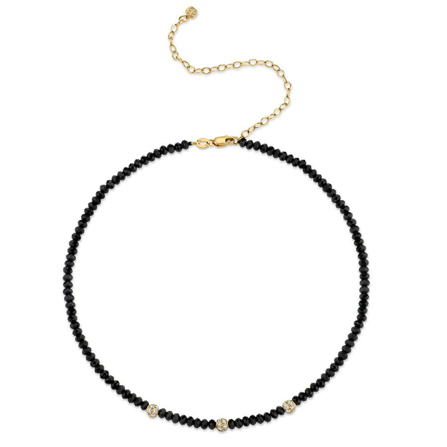This 14k yellow gold and diamond 4mm ball on a 4mm black spinel choker necklace captures the balance between light and dark, symbolizing harmony and strength. The shimmering diamond ball represents inner brilliance and resilience, while the deep black spinel reflects protection and grounding energy. Together, they create a striking juxtaposition of elegance and boldness. The 15-inch choker sits close to the neck, symbolizing intimacy and connection, while the minimalist design adds a contemporary edge, making it a timeless piece for those who value both beauty and meaning in their jewelry.