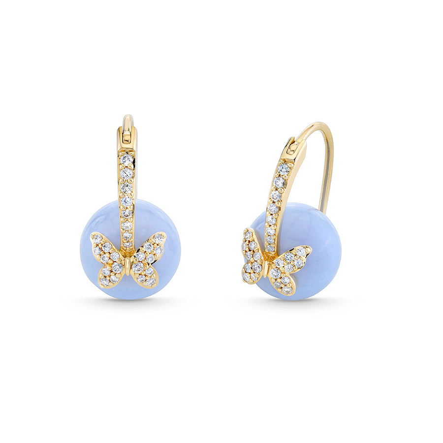 14k yellow gold butterfly bead earrings feature pavé-set diamonds with 10mm blue lace agate beads. Measure approximately 5/8" h x 3/8" w. Fine 14k gold hinged wire closure.