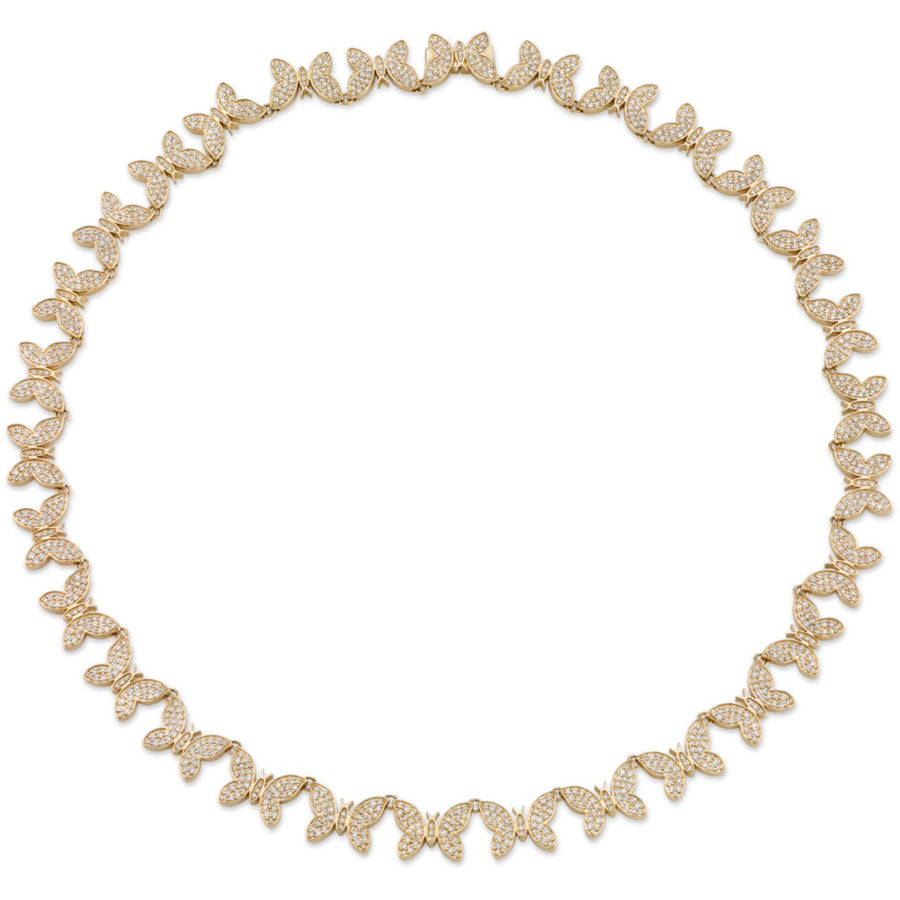 This 14k yellow gold and diamond butterfly eternity necklace embodies the beauty of transformation and the enduring power of love. The delicate butterflies, adorned with sparkling diamonds, symbolize freedom, growth, and the cyclical nature of life. Set in lustrous 14k yellow gold, the piece exudes warmth and vitality, while the eternity design reflects timelessness and unbreakable connections. With a total length of approximately 16", this necklace gracefully drapes the neckline, making it a perfect symbol of beauty, resilience, and everlasting elegance.