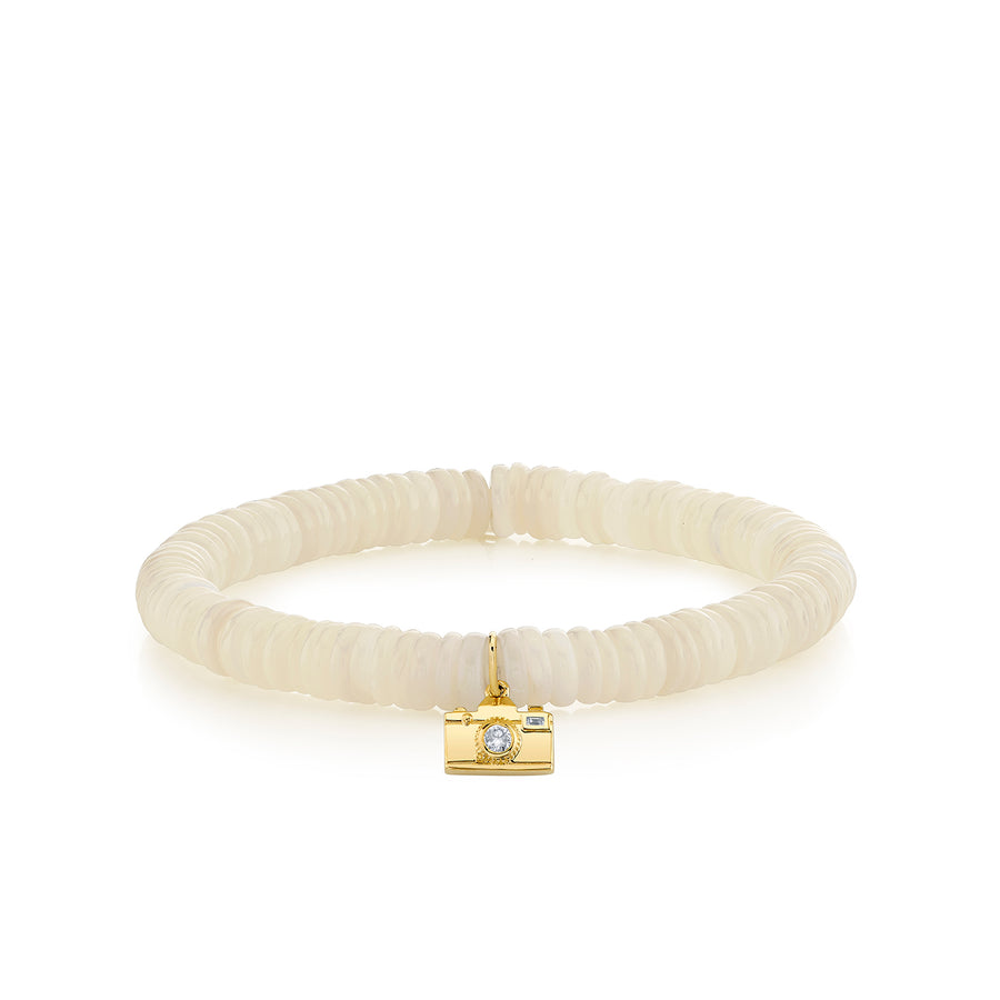 Enhance your look with this elegant bracelet showcasing a gold camera charm accented with diamonds, set against delicate 6mm mother of pearl disc beads. This striking centerpiece offers a polished sparkle and classic appeal, ideal for those who value a blend of timeless elegance and contemporary style.