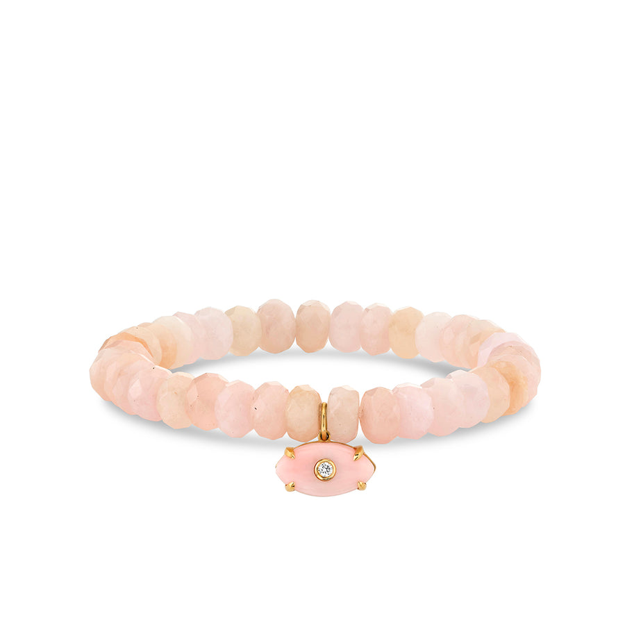 Made with high-quality materials, this Gold & Diamond Carved Pink Opal Eye on Morganite bracelet is the perfect addition to your collection. The charm, made of 14k gold and adorned with diamonds, features a beautifully carved pink opal bezel in the shape of a protective eye. This symbol is believed to bring protection and ward off negative energy.