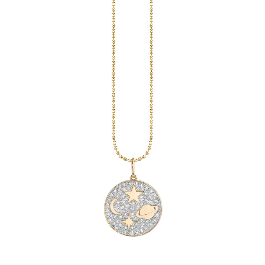 This 14k yellow and white gold celestial tableau medallion, featuring pavé-set diamonds, embodies the timeless beauty of the stars and the night sky. The harmonious blend of warm yellow gold and luminous white gold represents the balance between light and dark, while the diamonds evoke the glimmer of distant stars. With a diameter just over 1/2", this medallion captures the vastness of the cosmos in a delicate form. Pair it with our 14k gold medium ball chain, available in 16" or 18", for a piece that seamlessly combines elegance, cosmic allure, and refined craftsmanship.