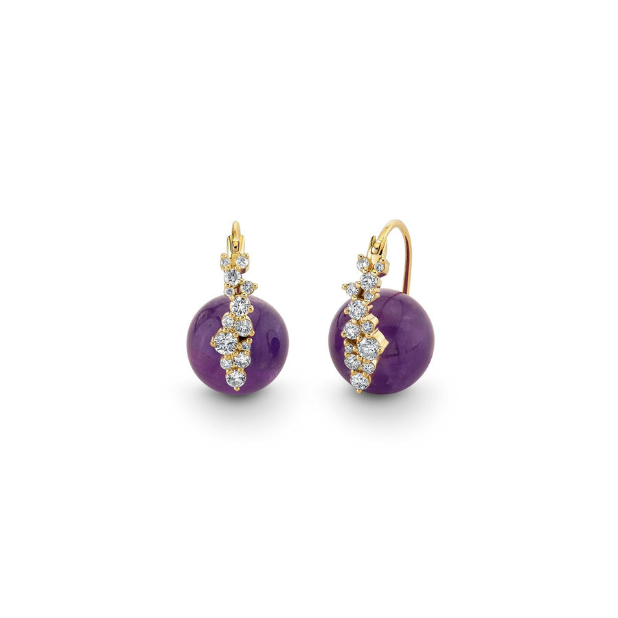 Made with 14k yellow gold and sparkling diamonds, these earrings exude elegance and sophistication. The focal point of these earrings are the stunning 12mm amethyst beads, adding a pop of color and personality to any outfit.