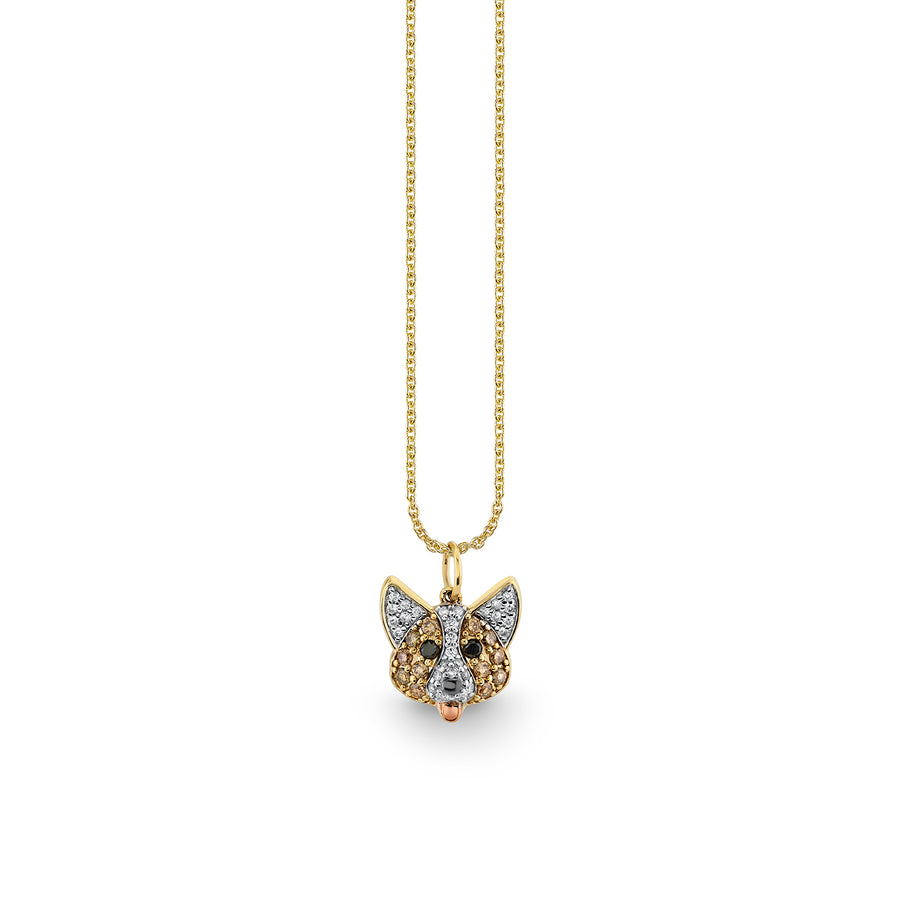 This charming necklace features a 14k yellow gold Corgi dog charm adorned with white, brown, and black diamonds. The charm, measuring approximately 1/2" in height and width, is a delightful tribute to the playful breed. It hangs from a fine 14k gold cable chain, available in a 16" length with a 2" extender for a customizable fit.
