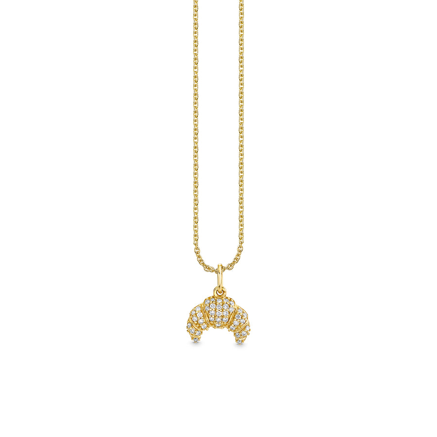 Made from 14k gold, this small croissant charm features a sparkling diamond accent for a touch of refined luxury. The charm measures approximately 1/4"H x 3/8"W, offering a subtle yet elegant design. It hangs on a fine 14k gold cable chain, 16" in length, with a 2" extender that allows for adjustable wear at 18".