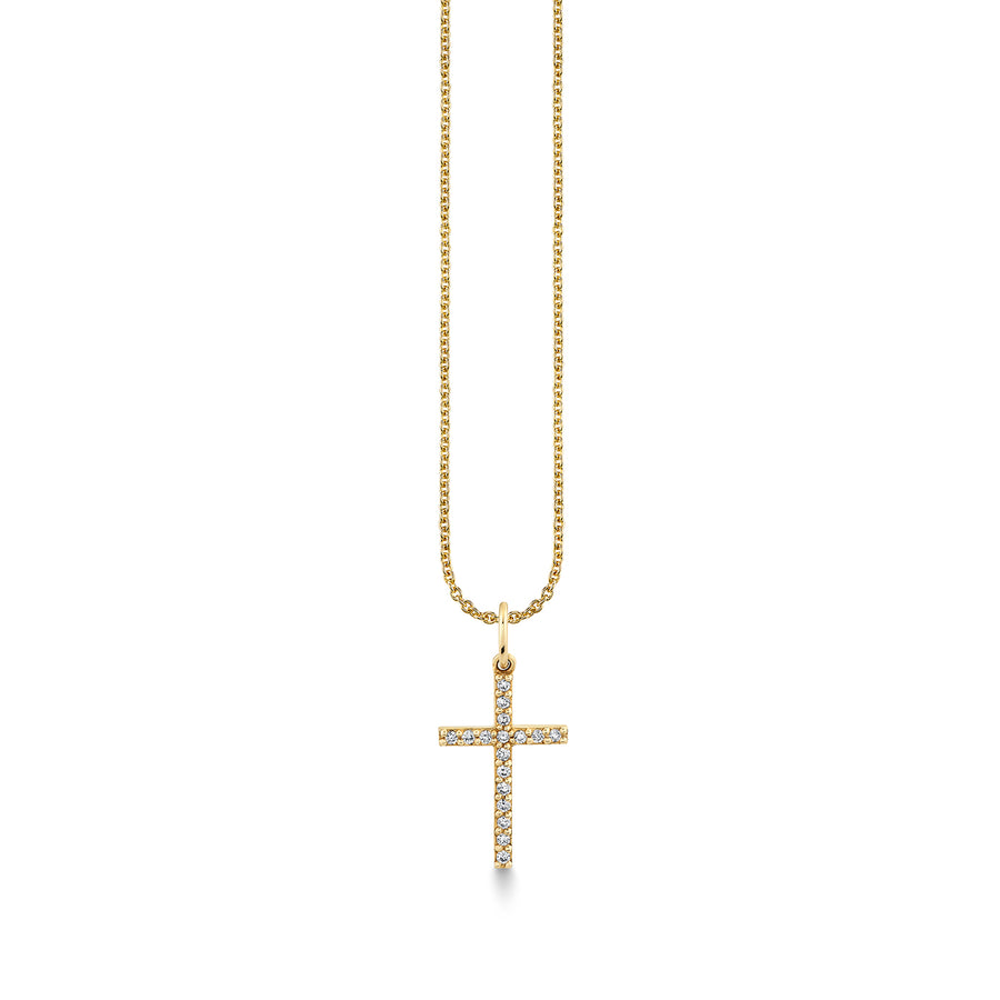 Crafted from fine 14k yellow gold, this delicate cross charm is set with radiant diamonds, adding a touch of sparkle to a timeless symbol. The charm measures approximately 1/2 inch in height by 3/8 inch in width, making it a subtle yet elegant piece. Paired with a 14k gold cable chain, adjustable from 16 to 18 inches for versatile wear, this necklace beautifully balances sophistication and simplicity—perfect for any occasion.