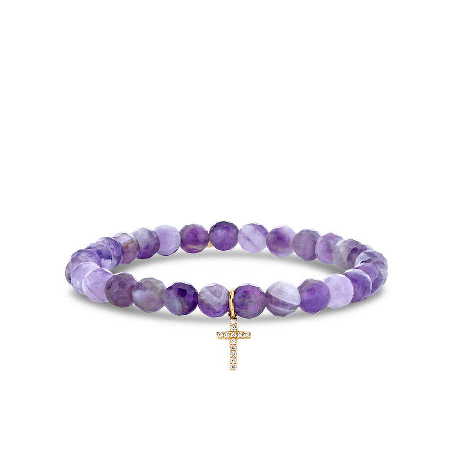 This stunning bracelet features a delicate 14k yellow gold cross charm, symbolizing faith, protection, and divine strength, elegantly set against a backdrop of 6mm faceted amethyst beads. Known for their soothing energy and connection to the spiritual realm, amethyst is believed to promote peace and clarity. The charm itself, measuring approximately 3/8"H x 1/4"W, adds a subtle yet powerful statement of grace and spirituality. All Sydney Evan beaded bracelets are meticulously strung on a durable stretch cord, accented with a signature 14k gold SE logo charm. Each piece is unique, as the natural variation in the color and shape of the precious and semi-precious stones reflects the beauty of their organic origin. The standard size is approximately 6.25", but for a personalized fit, custom size requests are warmly welcomed.