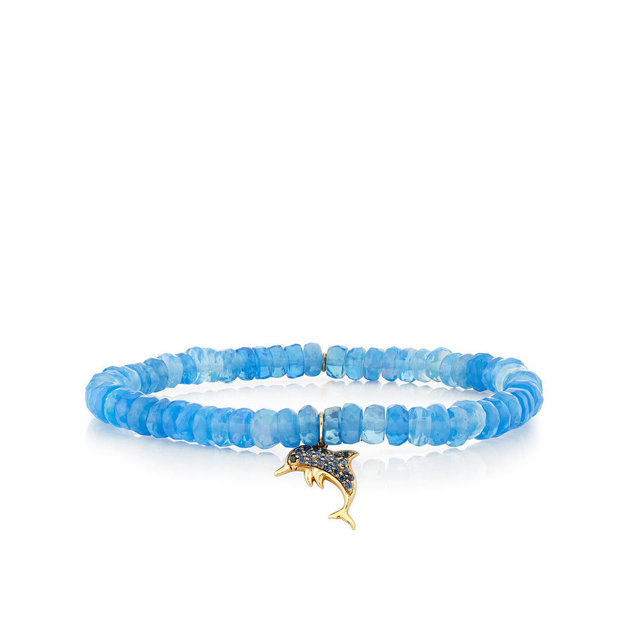 Crafted from 14k gold, this playful dolphin charm is adorned with sparkling diamonds and light sapphires, gracefully suspended on 4mm cobalt whisper Ethiopian opal faceted rondelles. The deep, rich blue of the opals complements the lively design, symbolizing freedom and joy. A whimsical yet refined piece, perfect for adding a touch of charm and elegance to your collection.
