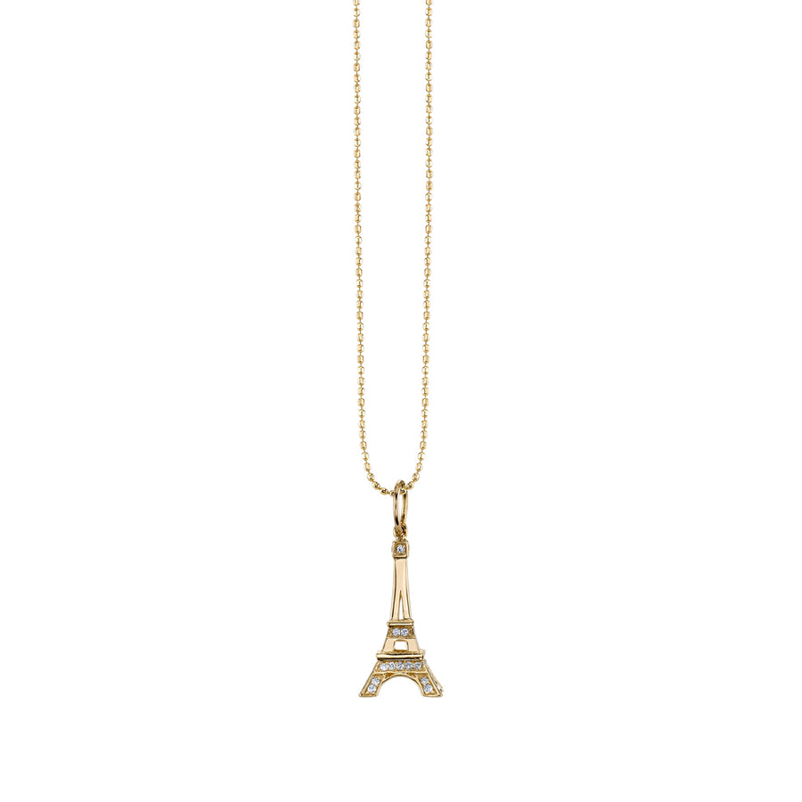 This exquisite 14k yellow gold and diamond Eiffel Tower charm necklace captures the essence of Parisian elegance and romance. The charm, measuring approximately 5/8" in height and 3/8" in width, is meticulously crafted with a delicate diamond accent, adding a subtle touch of sparkle to this iconic symbol of love and timeless beauty. The Eiffel Tower, a beloved landmark, represents strength, innovation, and the enduring allure of French culture. Suspended on a fine 14k gold ball chain, this necklace is available in 16" or 18" lengths, offering a perfect fit for any occasion. A charming reminder of Paris' romantic spirit, it makes an ideal gift for those who cherish adventure, elegance, and the allure of the City of Light.