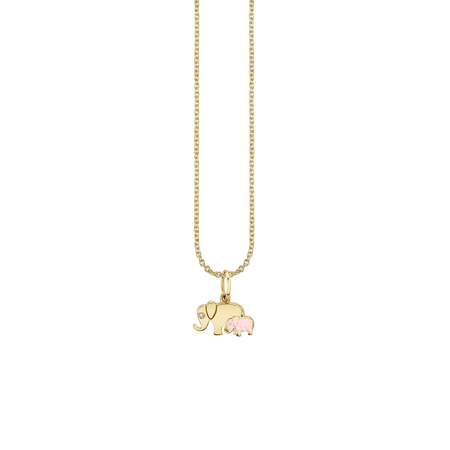 Celebrate the bond of family and nurturing love with this charming 14k yellow gold elephant family necklace. Featuring a delicate baby enamel elephant beside its mother, the charm measures approximately 3/8" wide by 1/4" high, symbolizing protection, loyalty, and unconditional care.