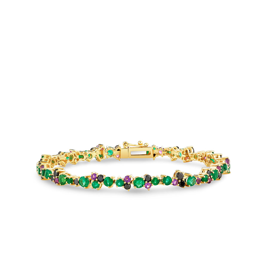 Crafted from 14k gold, this exquisite cocktail eternity bracelet measures 6.75" in length, making it a perfect fit for adding a touch of elegance to any wrist. Featuring a mesmerizing blend of vibrant emeralds and rich amethysts, each gemstone is carefully set to create a stunning contrast against the warm glow of the gold. The eternity design symbolizes everlasting beauty and style, making it an ideal choice for those who appreciate unique artistry. Perfect for both special occasions and everyday wear, this piece embodies a charm that celebrates individuality and flair.