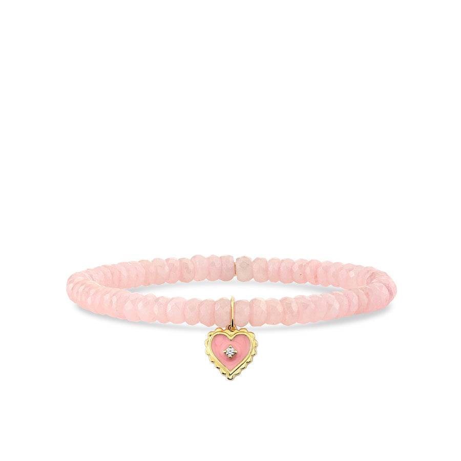 This exquisite bracelet celebrates love and individuality, featuring a 14k yellow gold and diamond heart charm, a timeless symbol of affection and devotion. Accented with delicate blush enamel and strung on 5mm faceted mystic pink grapolite beads, known for their grounding and calming properties, this piece embodies both elegance and inner harmony.