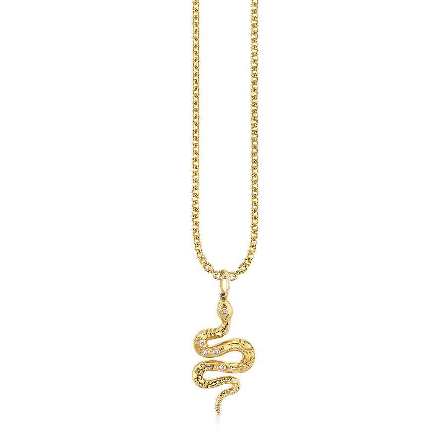 Crafted in radiant 14k yellow gold, this intricately etched snake charm shimmers with a delicate diamond accent, symbolizing transformation, protection, and eternal renewal. Measuring approximately 7/8" in height and 1/2" in width, the serpent’s sinuous form evokes ancient wisdom and empowerment. Suspended from a fine 14k gold cable chain, adjustable from 16" to 18", this timeless piece embodies elegance and mystique—an enduring talisman for growth and strength.