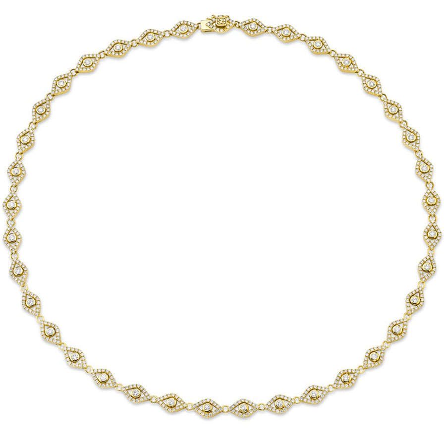 This exquisite 14k yellow gold and diamond protective eye eternity necklace is a timeless symbol of protection and positive energy. Crafted with fine attention to detail, the necklace features a stunning array of diamonds set in a delicate evil eye design, believed to guard the wearer against negative energy and bring good fortune. The elegant 16" chain offers a versatile, chic look that sits perfectly on the neckline, making it an ideal accessory for everyday wear or special occasions. The combination of yellow gold and diamonds creates a luxurious yet meaningful piece that reflects both beauty and powerful symbolism.