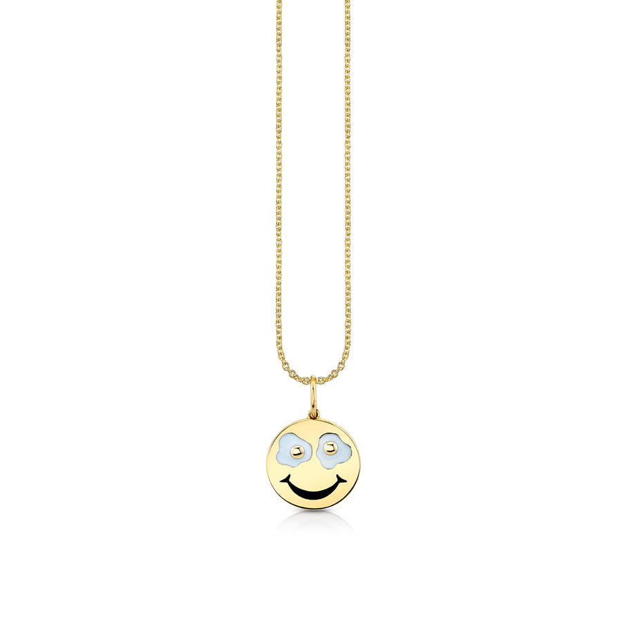 This playful and vibrant 14k yellow gold charm features a delightful happy face design, complete with sparkling diamonds and whimsical fried egg enamel eyes. The charm symbolizes joy, positivity, and a carefree spirit, with the sunny fried egg eyes evoking warmth and happiness. The charm measures approximately 3/8" x 3/8", offering a subtle yet charming statement. It hangs from a fine 14k gold cable chain, adjustable between 16" and 18" with a convenient extender. This piece is a perfect blend of luxury and lighthearted fun, ideal for adding a touch of cheerful elegance to any outfit.