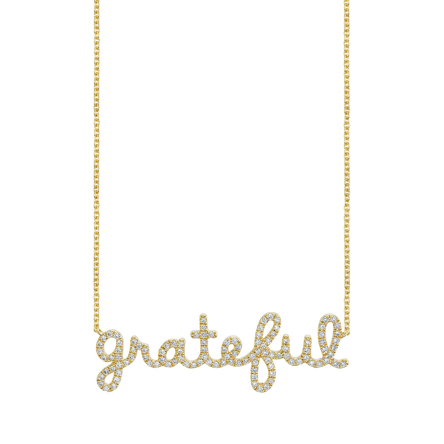 This elegant 14k Yellow Gold and Diamond Grateful Script Necklace is a beautiful reminder to appreciate life's blessings. The graceful "Grateful" script, measuring approximately 1 3/8" W x 1/2" H, is set in radiant 14k yellow gold and adorned with shimmering diamonds, adding a touch of sparkle to its meaningful message. The fine 14k yellow gold cable chain, adjustable in length from 16" to 18", complements the pendant's elegance, ensuring a perfect fit for any occasion.