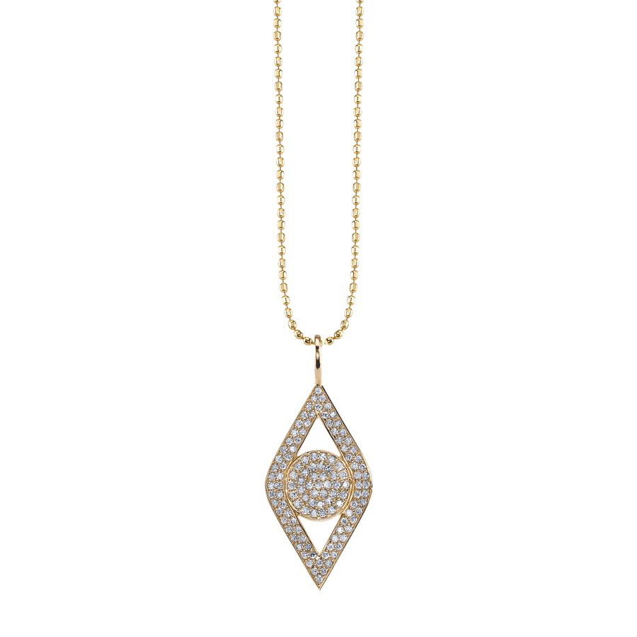 This 14k yellow gold and diamond extra large protective eye charm necklace is a stunning piece that combines luxury with deep symbolism. The protective eye, known for its protective properties, serves as a talisman against negative energy and ill will. Crafted in radiant 14k yellow gold, the charm measures approximately 1 1/8" H x 5/8" W, making it a bold yet refined statement piece. The delicate 14k gold medium ball chain is available in 18", 20", and 22" lengths, allowing for versatility and comfort. Adorned with sparkling diamonds, this necklace not only enhances your style but also offers a meaningful symbol of protection, making it an ideal gift or personal adornment. Perfect for layering or wearing solo, it’s a timeless addition to any jewelry collection.
