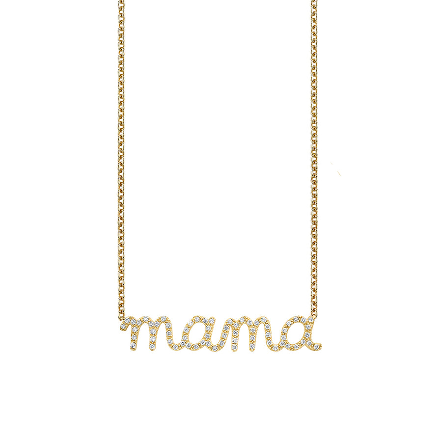 This stunning MAMA necklace celebrates the bond of motherhood with a touch of elegance. Crafted in 14k yellow gold, the necklace features the word "MAMA" spelled out in the brand's signature hand-drawn script, symbolizing love, strength, and the unbreakable connection between a mother and her children. The script measures approximately 1 2/3" in length and 1/2" in height, making it a bold yet delicate statement piece. Suspended from a 14k gold heavy cable chain that measures 16" in length with an adjustable 18" option, this necklace offers versatility and comfort. The pavé diamonds add a hint of sparkle, enhancing the piece's beauty while maintaining a timeless and meaningful design. Whether for a special occasion or an everyday reminder of love, this necklace is a perfect gift for the modern mom.