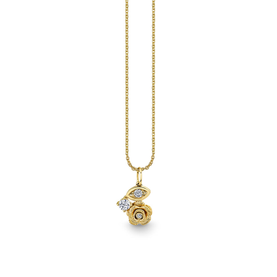 Elevate your jewelry collection with this exquisite charm necklace, crafted from luxurious 14k yellow gold. The centerpiece is a captivating large charm adorned with a marquise-cut eye, symbolizing protection and insight. This charm is elegantly complemented by a delicate rose motif, set in a dazzling diamond bezel that adds a touch of timeless romance.