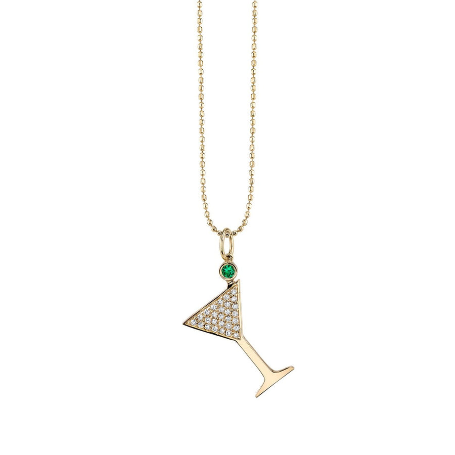This elegant 14k yellow gold large martini cocktail charm features pavé diamonds and a bezel-set emerald, creating a striking and luxurious design. The charm measures approximately 3/4" in height and 1/2" in width, making it a bold yet refined statement piece. Crafted from high-quality 14k gold, the charm is available with a fine gold ball chain in 16" or 18" lengths, offering versatility for any occasion.
