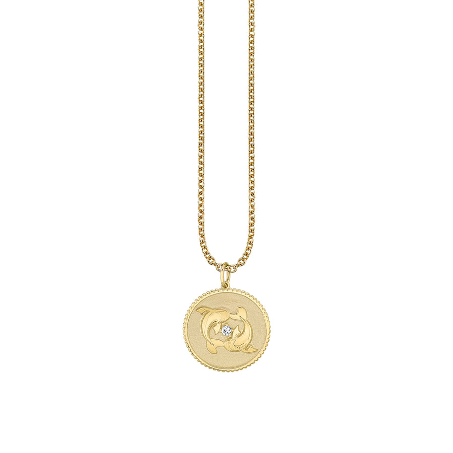 14k yellow gold zodiac medallion necklace with center diamond. Authentic to true coin style by featuring two sides. Charm measures approximately 3/4" in diameter. 14k gold heavy cable chain available in 16" length with an extra loop at 18".