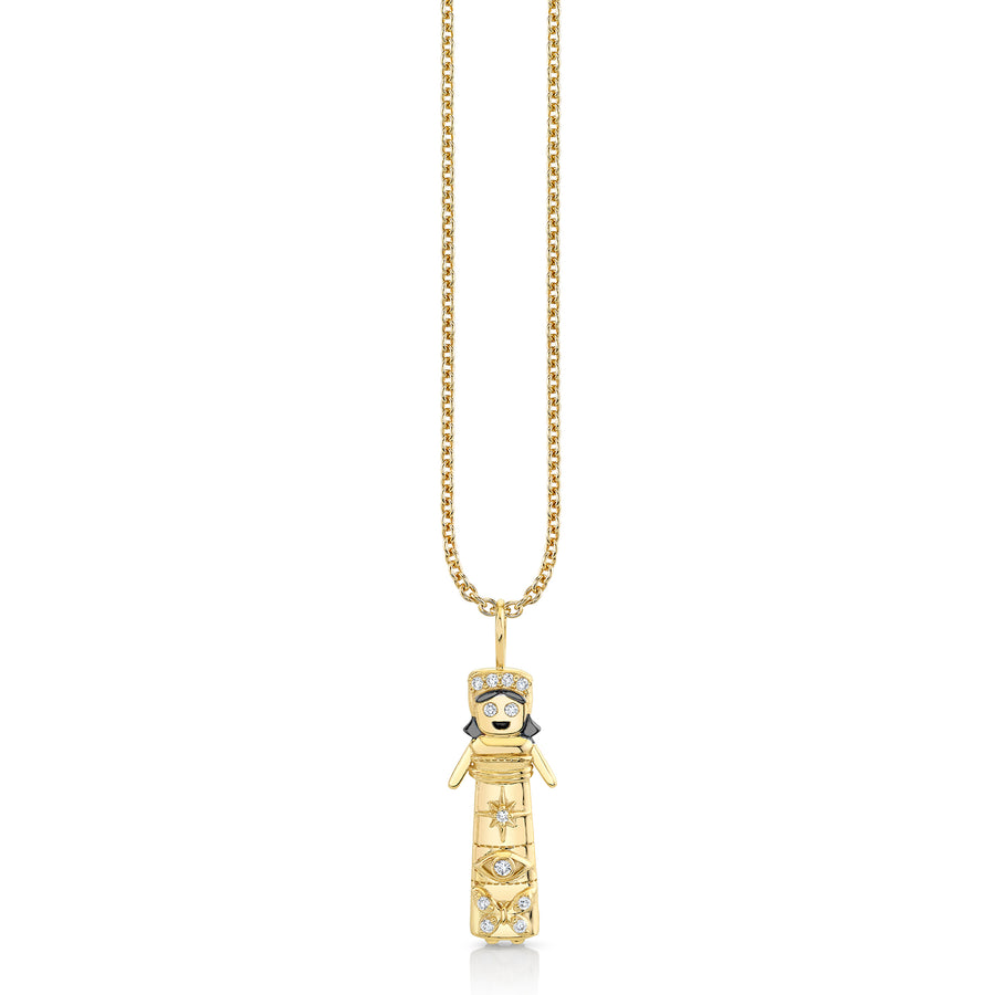 14k yellow gold and diamond large Rosanna doll charm necklace. The charm features a starburst, a protective eye and a butterfly. Charm approximately measures 3/8"W x 1"H. Fine 14k gold cable chain is 16" long with an extender at 18".