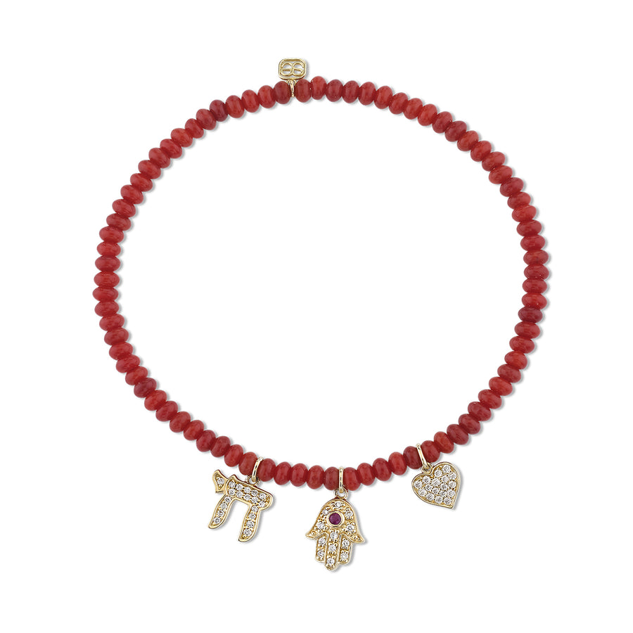 Celebrate the powerful energies of love, life, and protection with this elegant 14k gold and diamond multi-charm bracelet, delicately strung on vibrant 3mm red bamboo beads known for their natural warmth and grounding properties. This meaningful bracelet features three iconic Sydney Evan charms, each symbolizing a unique blessing: