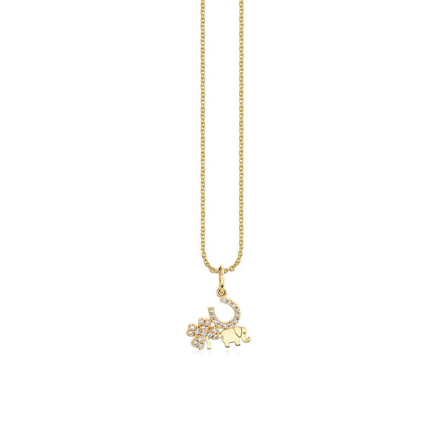 14k yellow gold and diamond luck charm features a pure gold elephant, a diamond shamrock clover and a diamond horseshoe. Charm measures appx. 3/8"H x 1/2"W. Fine 14k gold cable chain is 16" long with and extender at 18".