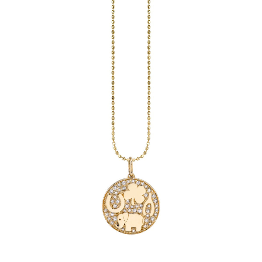 A radiant tribute to fortune and positivity, this 14k yellow gold luck tableau medallion necklace features a beautifully detailed charm adorned with pavé-set diamonds. The medallion brings together symbolic elements of luck, protection, and intention, forming a miniature talisman to carry close to your heart.