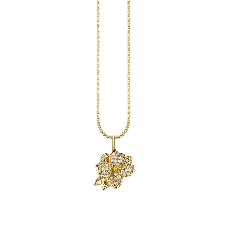 14k yellow gold and diamond magnolia charm necklace. Fine 14k gold cable chain is 16" long with an extender at 18". The charm measures approximately 1/2" x 1/2".