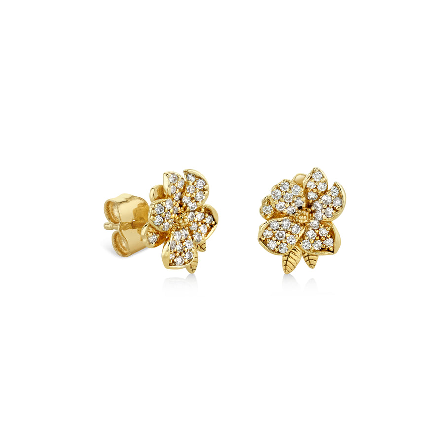Celebrate natural beauty with these exquisite 14k gold magnolia stud earrings, featuring a delicate floral design encrusted with shimmering pavé-set diamonds. Each earring measures approximately 3/8" x 3/8", offering a graceful and refined statement perfect for everyday wear or special occasions.