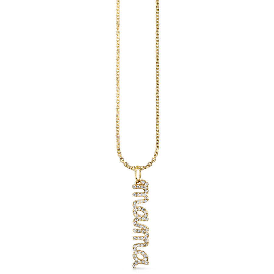 14k yellow gold and diamond mama charm necklace. Fine 14k gold cable chain is 16" long with an extender at 18". The charm measures approximately 1"H x 1/8"W.