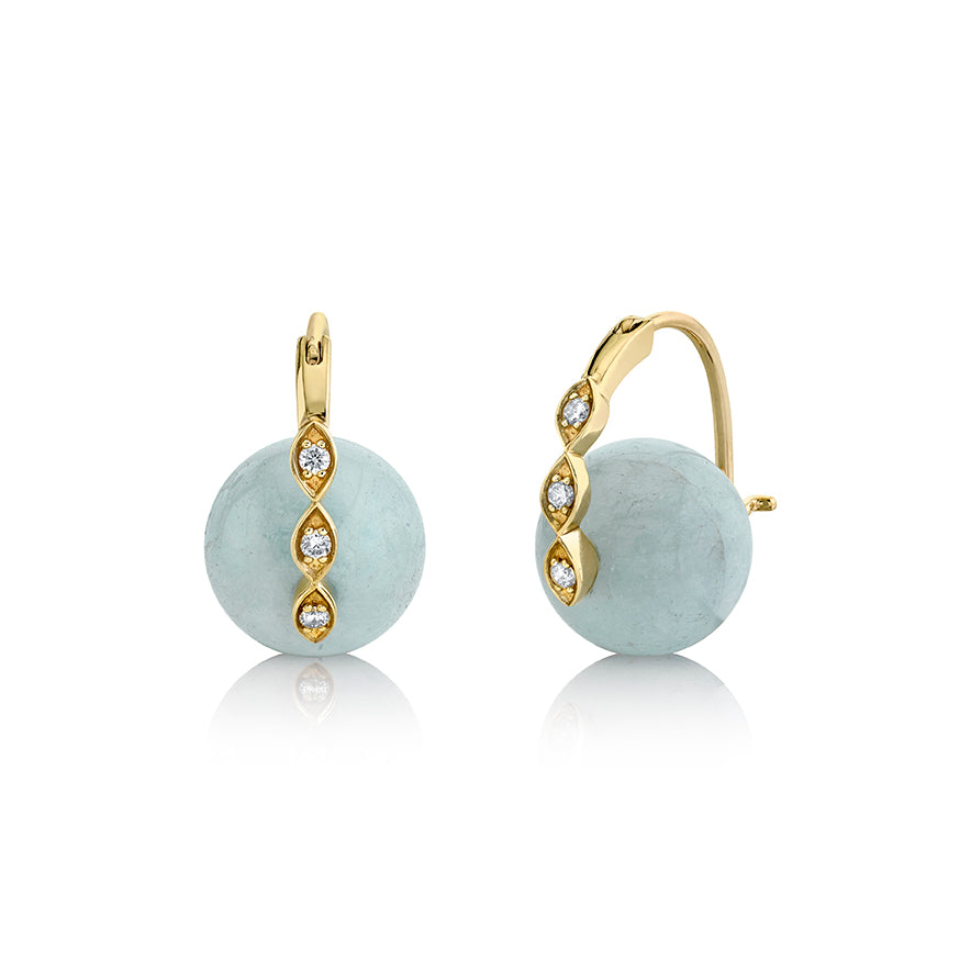 These elegant 14k yellow gold earrings are inspired by the symbolism of protection and vision, with a marquis-shaped eye design that evokes the all-seeing eye, a symbol of clarity and spiritual insight. At the center, sparkling diamonds represent purity and strength, while the stunning 8mm, 10mm or 12mm aquamarine beads embody calm, peace, and emotional healing. The earrings measure approximately 5/8" in height and 3/8" in width, offering a delicate yet impactful presence. Finished with a fine 14k gold hinged wire closure, these earrings combine beauty with meaningful symbolism, making them both timeless and transformative.