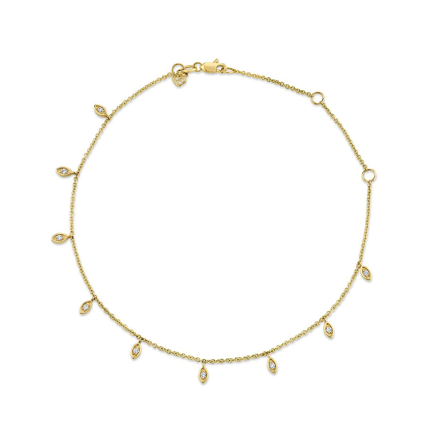 Add a touch of delicate sparkle to your every step with this exquisite 14k gold marquis fringe ankle bracelet. Featuring multiple diamond-accented marquis-shaped fringes, each measuring approximately 1/4" long, this bracelet blends timeless elegance with modern movement.