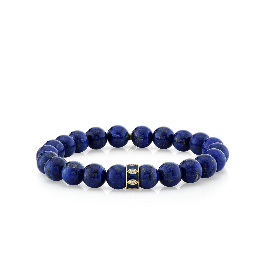 Embrace protective energies with our 14k yellow gold and diamond marquise eye rondelle, adorned with navy enamel, set amidst 8mm lapis smooth beads. Symbolizing intuition and wisdom, lapis beads are accented with a rondelle measuring approximately 1/4'W x 1/4'H. Each Sydney Evan beaded bracelet features our signature 14k gold SE logo charm and is meticulously strung on a stretch cord. Variations in bead color and shape reflect the uniqueness of precious and semi-precious stones. The standard size is approximately 6.25', with customization available upon request.
