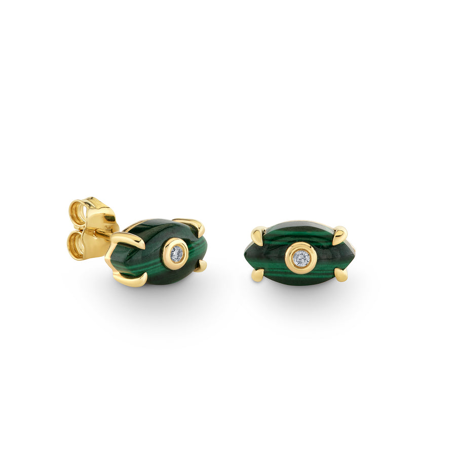 These medium-sized stud earrings are meticulously crafted with a 14k gold setting that elegantly frames a carved stone bezel featuring malachite. The deep green tones and intricate natural patterns of malachite are beautifully showcased in an eye-inspired design, symbolizing protection and insight. The polished gold enhances the stone’s vibrant hues, resulting in a refined accessory that balances artistry with symbolism. Ideal for individuals who value thoughtful craftsmanship and a timeless statement piece, these studs add a sophisticated touch to any ensemble while carrying meaningful significance.