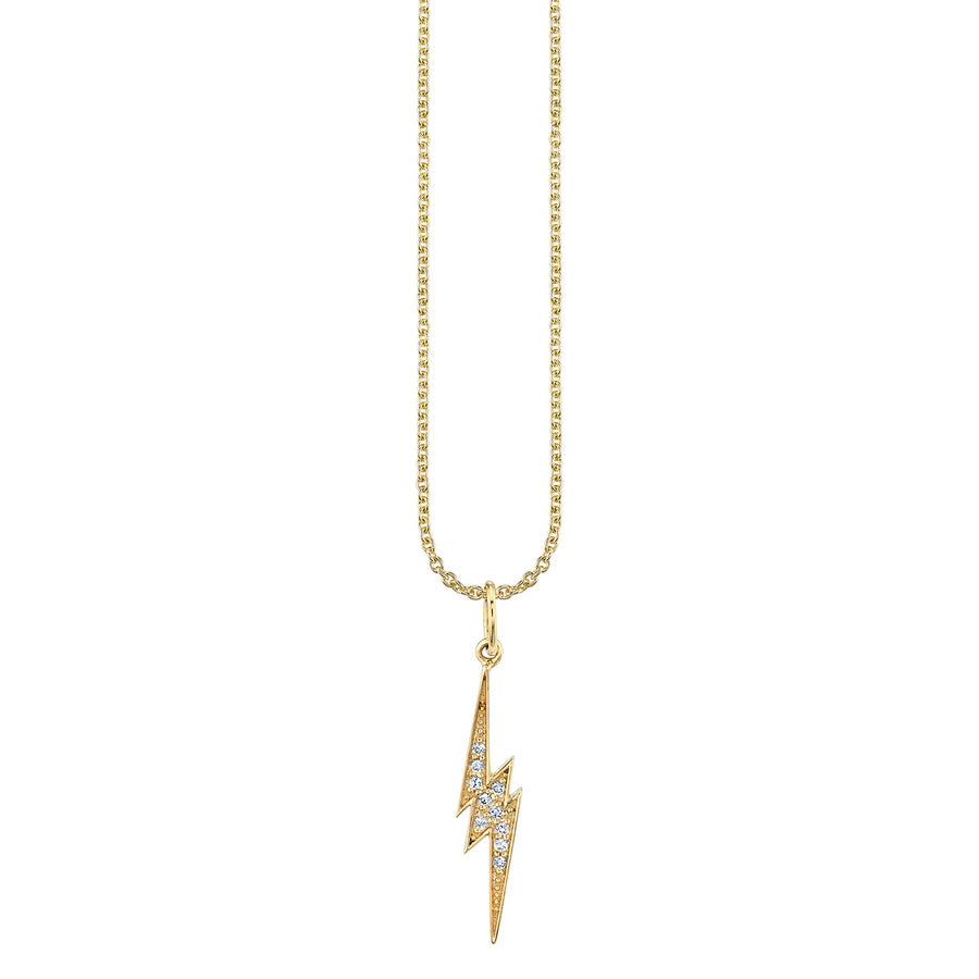 Make a bold statement with this striking 14k yellow gold medium lightning bolt charm, adorned with shimmering pavé-set diamonds for a touch of electrifying sparkle. The charm measures approximately 3/4" x 1/8", balancing edgy style with elegant craftsmanship.