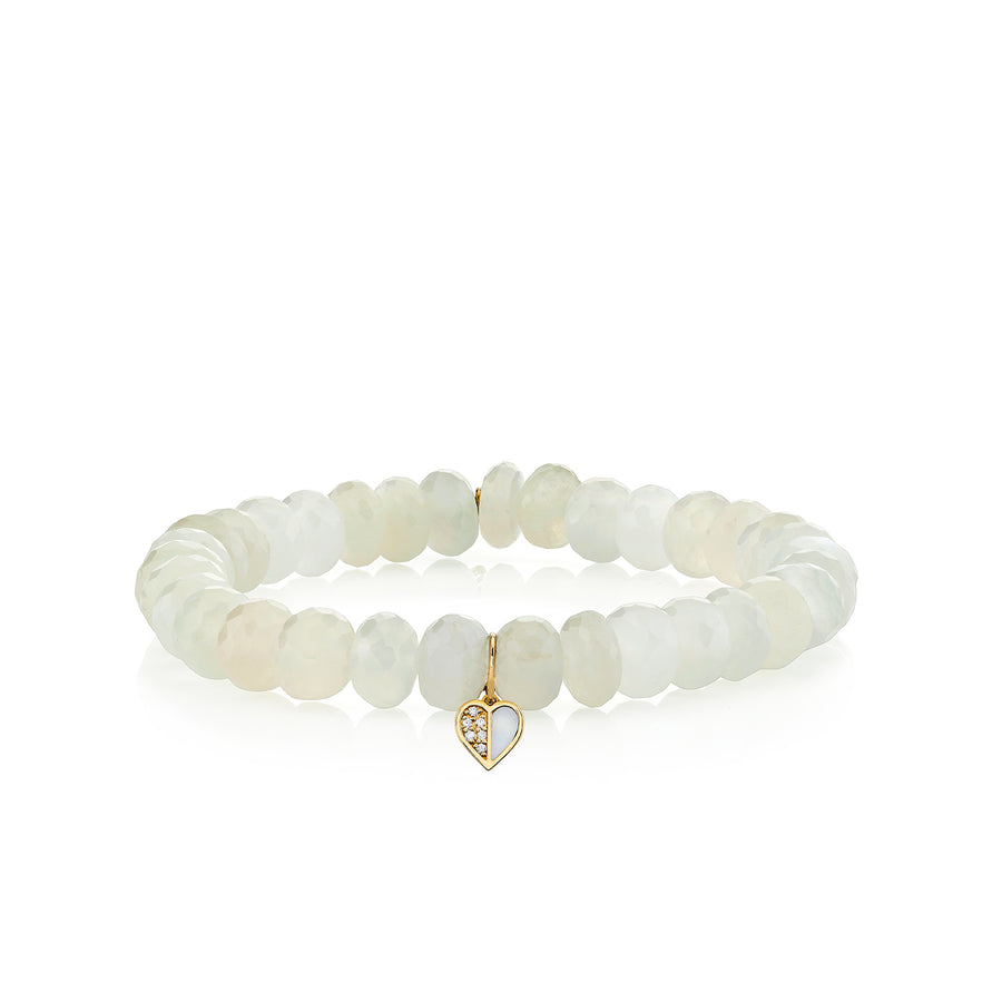 14k yellow gold and diamond mini heart charm with mother of pearl inlay on 8mm white moonstone beads. All Sydney Evan beaded bracelets are strung on a stretch cord along with our 14k gold SE logo charm. Beads color and shape may vary slightly due to the nature of the precious and semi-precious stones. Standard size is approximately 6.25", for all custom size requests, please contact us.