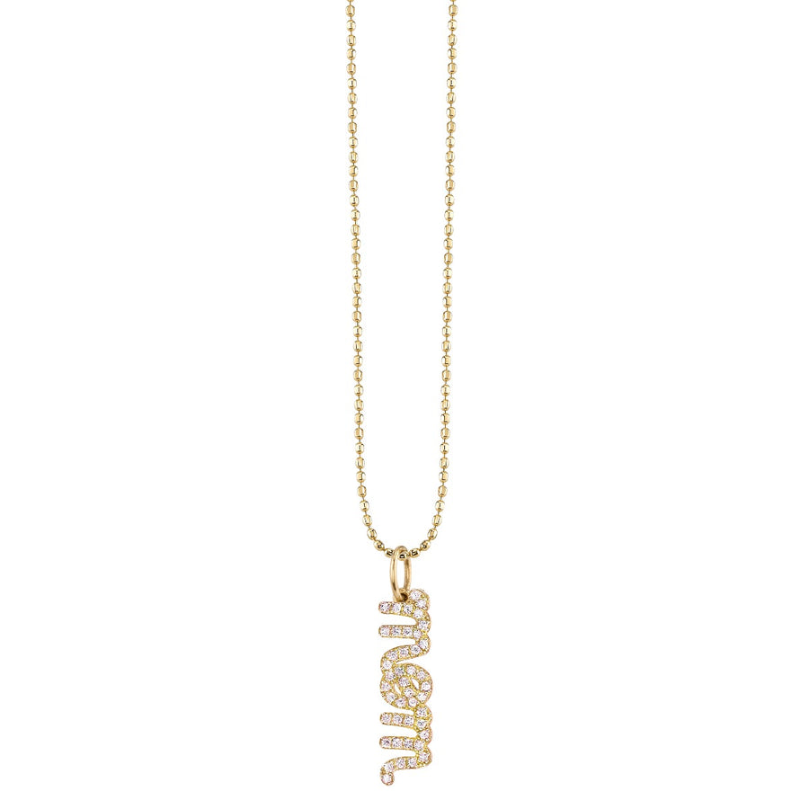 Celebrate the heart of the family with our 14k gold “Mom” charm necklace, delicately spelled out in our signature SE hand-drawn script and accented with pavé-set diamonds. A timeless symbol of love, strength, and devotion, this elegant charm measures approximately 1/4" high by 3/4" wide and hangs from your choice of a fine 14k gold ball chain in 16" or 18" length. A meaningful gift and a cherished keepsake, this piece honors motherhood with brilliance and grace.