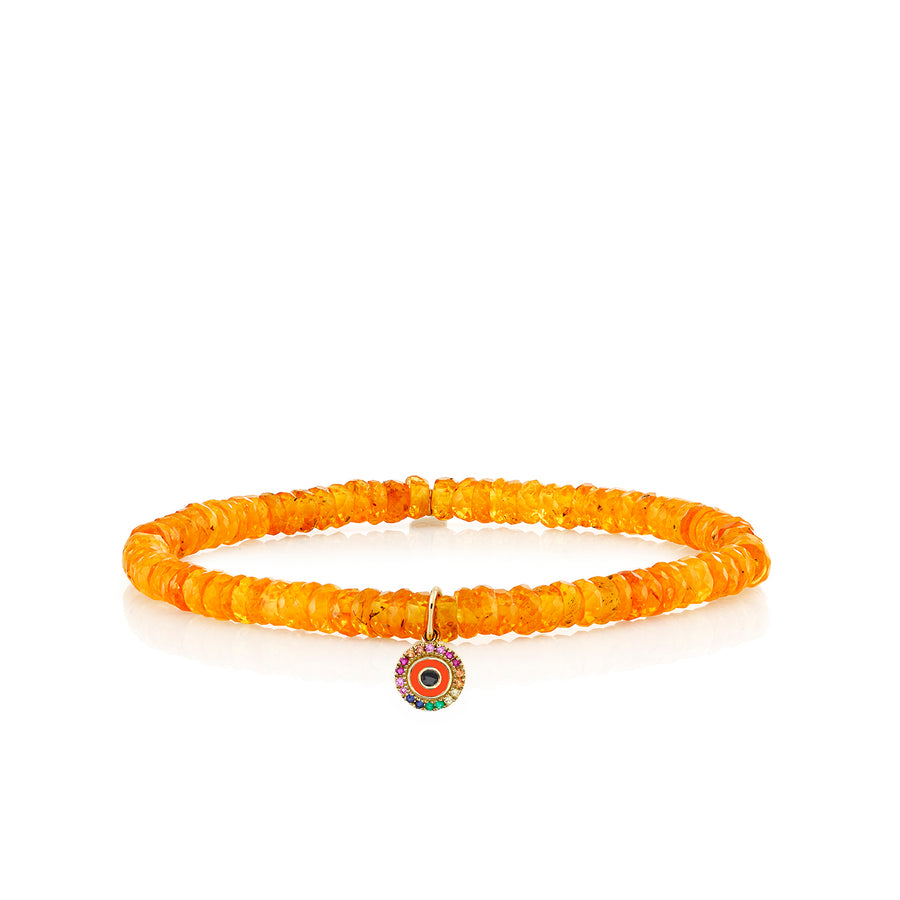Elevate your everyday elegance with this refined beaded bracelet, featuring a striking 14k gold protective eye charm adorned with sparkling diamonds and vibrant multi-color sapphires in delicate pave enamel work. The centerpiece is complemented by warm spessartite faceted wheel beads in a 5mm size, creating a harmonious blend of luxury and meaningful symbolism. This sophisticated piece combines fine craftsmanship with timeless design, perfect for those who appreciate jewelry that speaks to both style and substance.