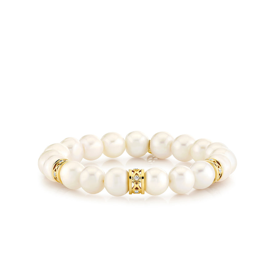 This elegant bracelet features three 8mm bezel fishnet rondelles artfully spaced on a strand of 9mm white potato pearls. The unique combination of lustrous pearls and intricate rondelle detailing creates a refined, timeless accessory that elevates any ensemble with subtle sophistication.