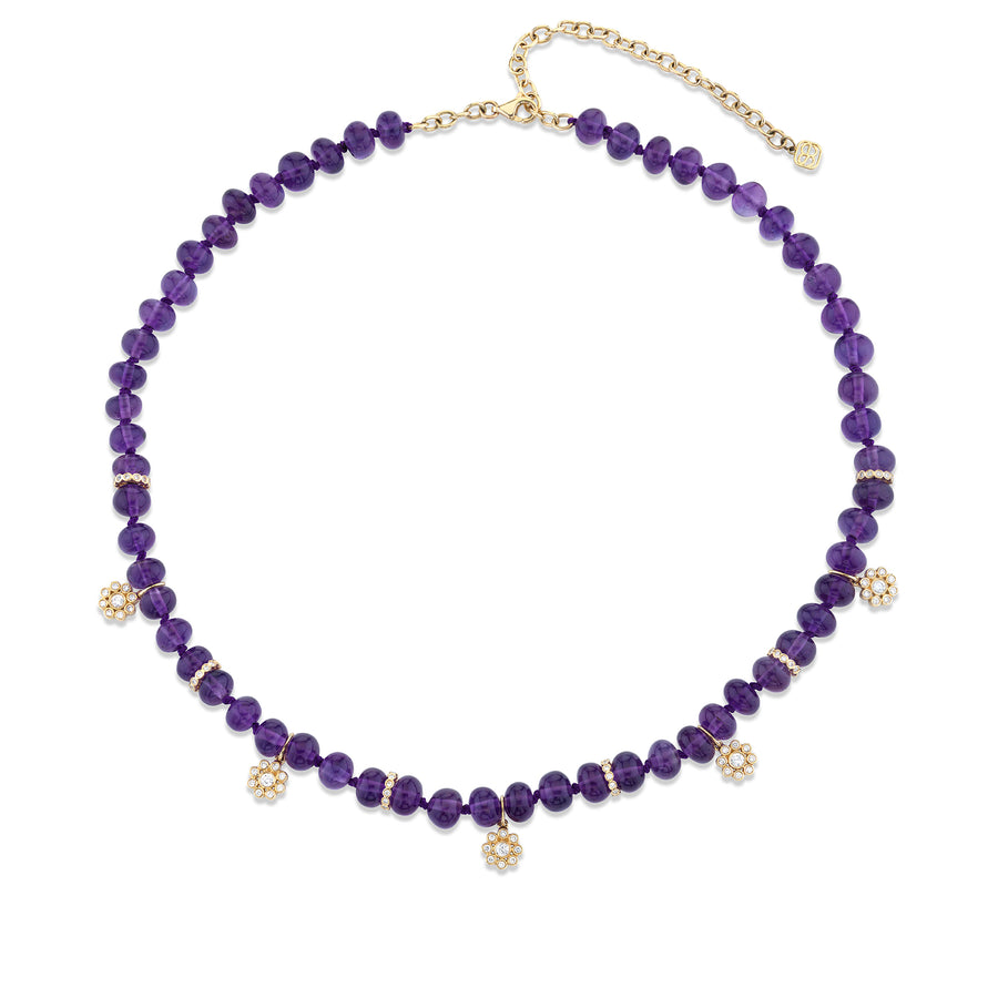 14k yellow gold beaded necklace features five diamond flower charms and 6 diamond rondelles. All charms are strung on 6mm amethyst smooth beads. The necklace is approximately 18" in total length, including a 3" chain extender.