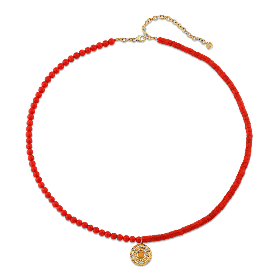 Crafted from 14k gold, this necklace features a striking combination of smooth peach coral round beads and coral heishi beads, creating a vibrant contrast in texture and hue. At its center hangs a marquise eye open wheel charm, set with a luminous opal that adds an ethereal glow. Designed with a balance of elegance and character, this necklace is a distinctive piece that seamlessly blends rich color, texture, and timeless symbolism.