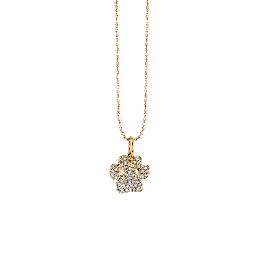 Celebrate unconditional love and loyalty with this 14k gold dog paw print charm, beautifully adorned with pavé-set diamonds. Measuring approximately 3/8" H x 3/8" W, this sparkling symbol of companionship is a heartfelt tribute to your furry best friend. Suspended from a fine 14k gold ball chain available in 16" or 18" lengths, this charm is a meaningful piece for pet lovers and a timeless reminder of the bond between you and your loyal companion.